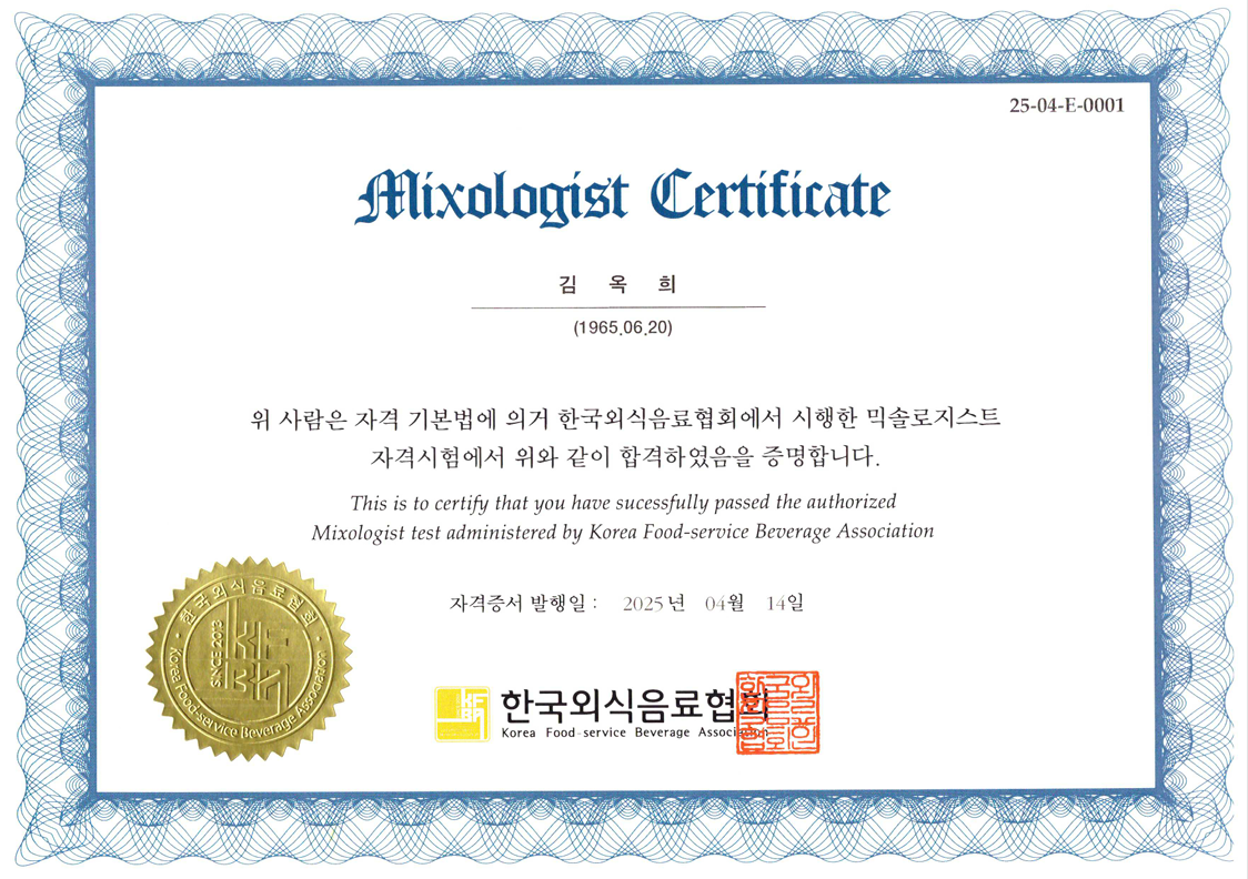 위 사람은 자격 기본법에 의거 한국외식음료협회에서 시행한 믹솔로지스트 자격시험에서 위와같이 합격하였음을 증명합니다